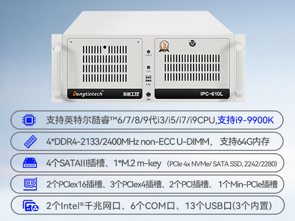 東田工控DT-610L-BQ270MA是一款4U機架式工控機,采用酷睿9代i99900k處理器,擁有5個PCIe插槽,至多可擴展20個網口。支持多種操作系統(tǒng)。內存4*DDR4至高64G。內存巨大,使用快速流暢,支持定制。
